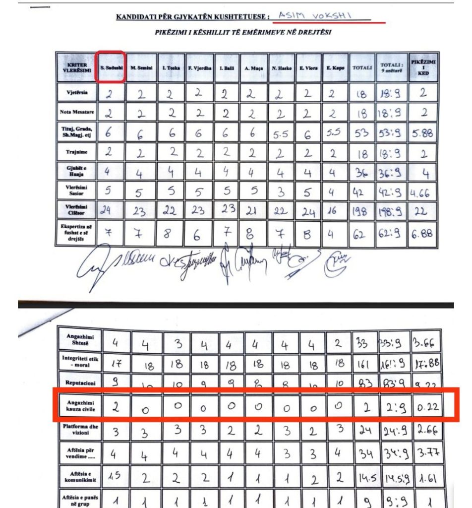 Por ajo që ka tronditur vëzhguesit është se në kriterin “Angazhimi në kauza civile”, të gjithë anëtarët e KED-it i dhanë 0 pikë Vokshit, përveç njërit — Sokol Sadushit, i cili e vlerësoi me 2 pikë.