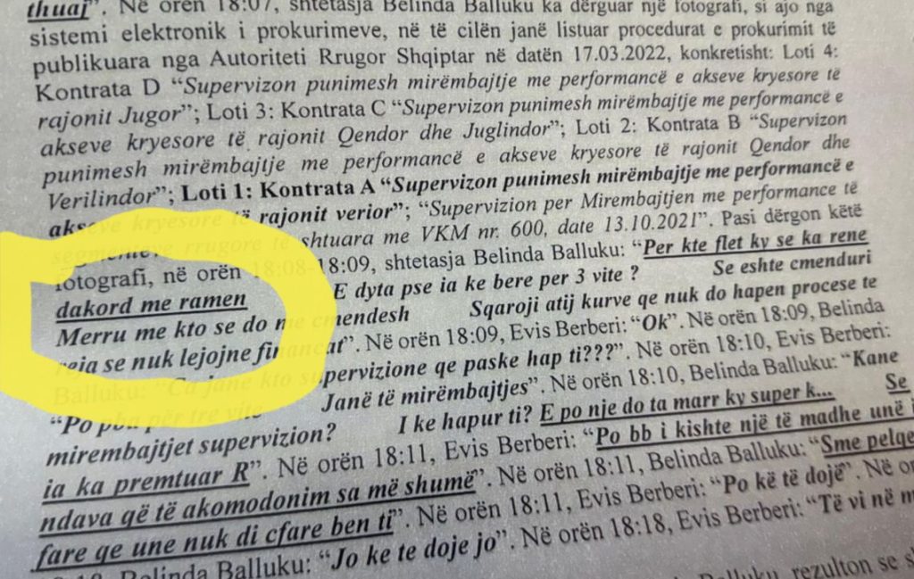 Sipas materialeve të lexuara publikisht, bisedat mes Ballukut dhe Berberit përmbajnë një gjuhë të drejtpërdrejtë dhe në disa raste vulgare, ndërsa emri i kryeministrit përmendet herë hapur dhe herë të tjera në mënyrë të koduar, përmes shkronjës “R”. Këto komunikime sugjerojnë se vendimmarrja për fituesit e tenderave nuk ka qenë thjesht teknike apo administrative, por e diktuar nga nivelet më të larta politike.